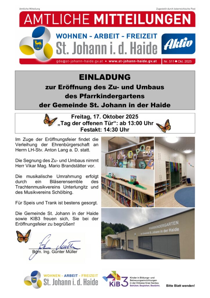 Einladung zur Eröffnung des Zu- und Umbaus des Pfarrkindergartens der Gemeinde St. Johann in der Haide